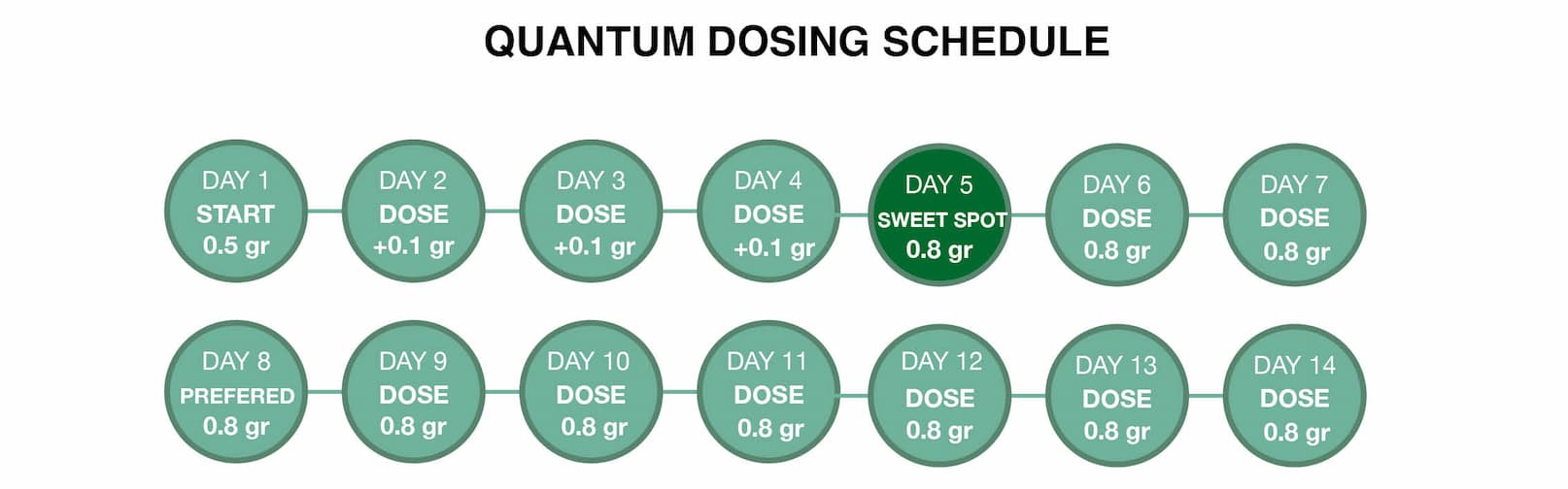 If you feel ready to take your Microdosing Routine to the next step, start with our Intensified Track with Quantum. This Track allows you to Microdosing everyday for 2-weeks, this intensified cycle is only suitable if you are already familiar with microdosing. Continue to increase your dose until you have found your Sweet Spot. You can continue your cycle with this dosage amount.