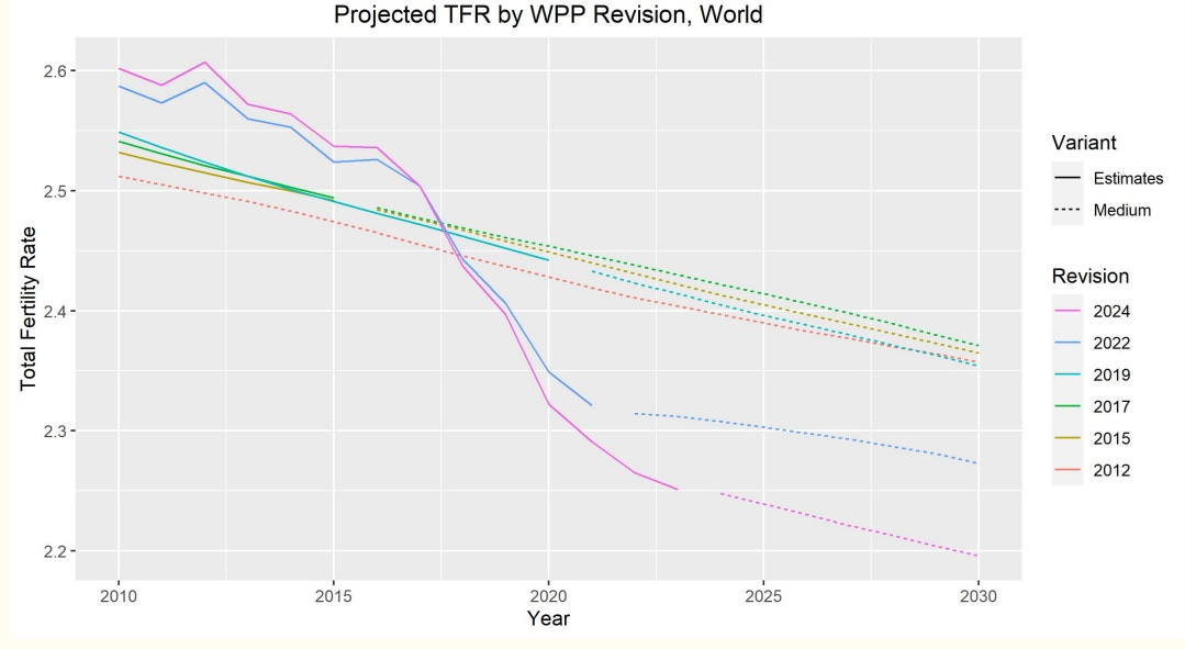 But this isn’t a post about China; it’s about the whole world. Those who expect China’s low fertility to end its bid to dominate the globe are in for a severe disappointment, since fertility is falling in the rest of the world as well. It’s true that China is an especially severe case — a TFR of less than 1.0 puts it in a special category with Korea, Taiwan, Singapore, and Thailand (Japan, interestingly, is still slightly higher). But over the past decade, fertility has begun collapsing all over the world, much faster than it had been declining before. Fernández-Villaverde has a good set of slides from 2023 explaining why the new fertility crisis is different and more urgent than traditional concerns. In earlier times, fertility tended to gently decline in each country until it was just under the replacement rate — the kind of baby deficit that seemed like it could be fixed with reasonable policies. But since the mid-2010s, the fertility decline has accelerated, and there seems to be no bottom to the new collapse; every year, statistical agencies revise their already negative projections downward even more.
