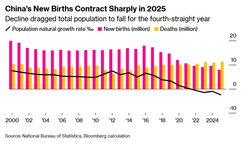 It’s difficult to state just how stark and catastrophic of a collapse this is. The number of births in China fell by 17% in just the last year. In fact, as economist Jesús Fernández-Villaverde recently pointed out, China had fewer births in 2025 than in 1776, when its population was less than a fifth of what it is now. China’s total fertility rate now stands at around 0.93, less than half the replacement level. At that rate, every four grandparents will have fewer than one grandchild. Fernández-Villaverde explains what this means for the future of China’s population: