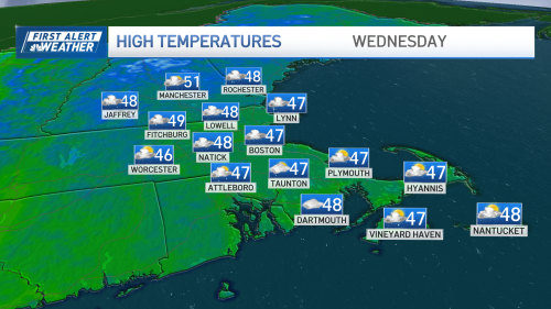 This is our coolest, dampest day of the week. Showers will pass through this morning, with a general gray overcast this afternoon. We’re not expecting a lot of water from this system. Just enough to keep the puddles around. And temps really don’t get up and get going at any point today. Mid and upper 40s should cover the range. Tomorrow is our warmest day of the week thanks to a northwest (not east) wind and plentiful sunshine. Highs will get to 60 in many spots. Unfortunately, this will also be the warmest we’ll see of the next several days. Cooler winds will come in both Friday — and both weekend days — to bring us back down to the low and mid-50s. For a little perspective, normal high temperatures these days are 59 in Boston and 58 in Worcester. |
