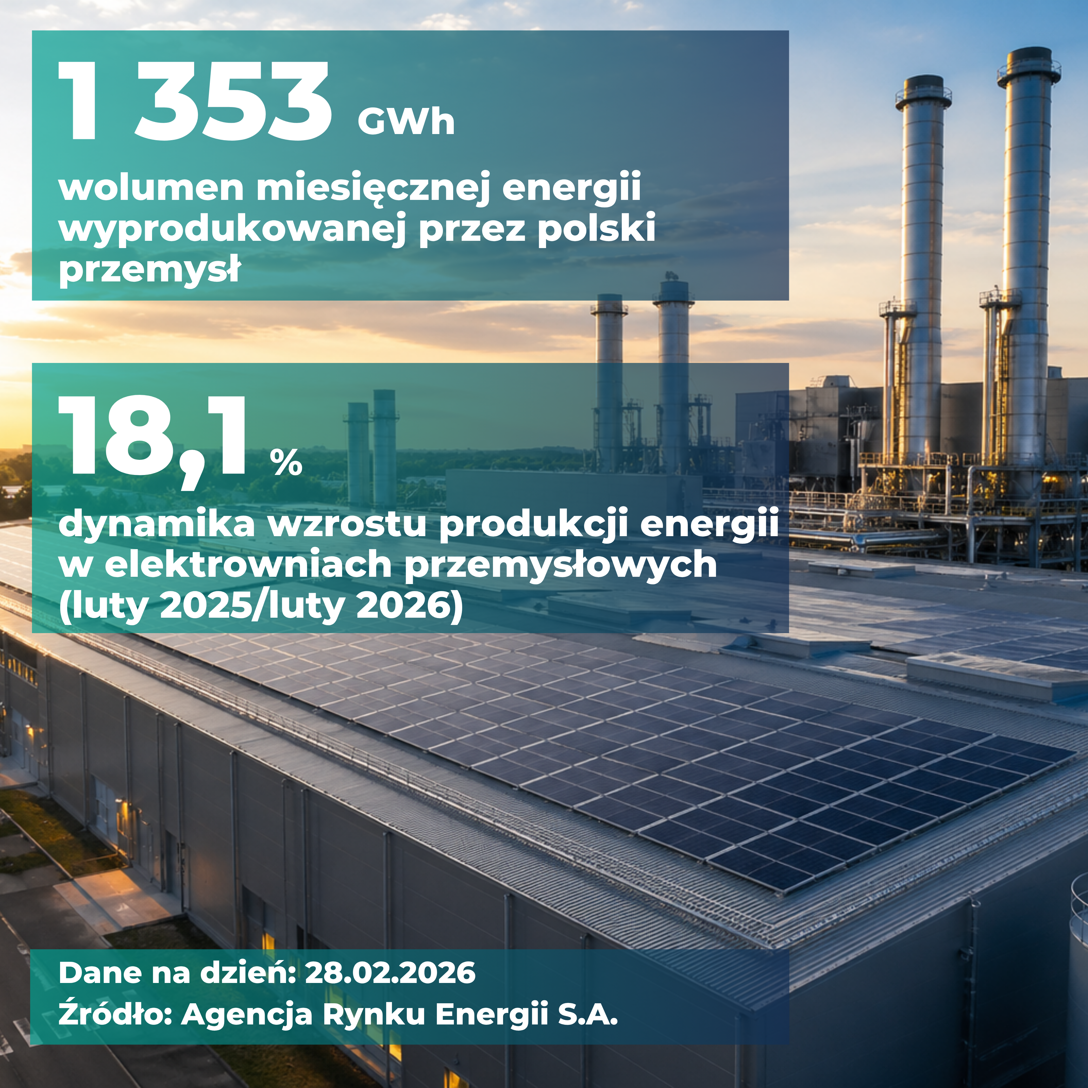 Tyle wyniosła łączna produkcja energii elektrycznej w elektrowniach przemysłowych w lutym 2026 roku.