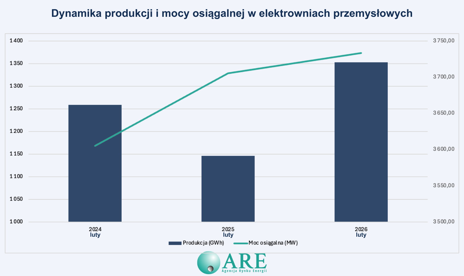 Moc osiągalna: Łączna moc elektryczna osiągalna w elektrowniach przemysłowych na koniec lutego 2026 r. wyniosła 3 733,6 MW (wzrost o 0,8% w ujęciu rocznym względem 3 705,6 MW w lutym 2025 r.).