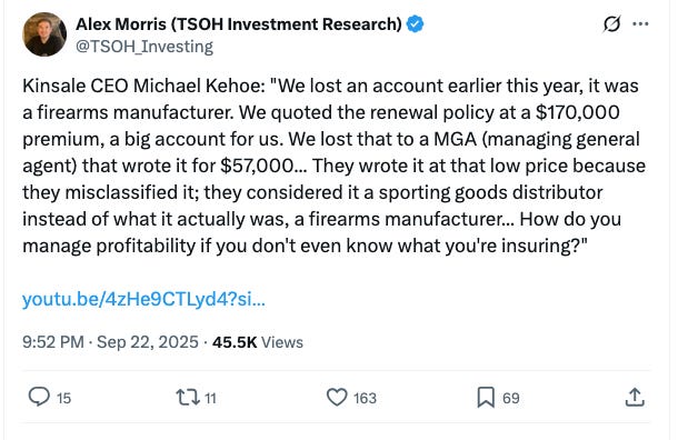 Update investment caseBrown & Brown is a phenomenal company in Our Portfolio. I’m very proud to own it. The interesting part? Insurance companies are struggling a little bit right now. This is something we like as we love to buy amazing companies at lower prices. The insurance industry is characterized by a soft market and hard market. They indicate the general conditions of the insurance industry: A hard market is usually more attractive for insurance companies like Brown & Brown. But today, we’re moving more and more into a soft market. Insurance companies are reducing their prices to attract new business. This results in more competitive pricing and reduced margins. This story from Mike Kehoe (CEO of Kinsale Capital) probably shows it best: