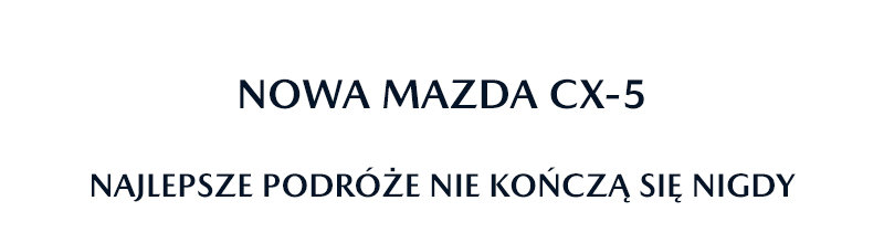Poznaj legendarnego, rodzinnego SUV-a w udoskonalonej, trzeciej generacji. Nowa Mazda CX-5 zachwyca elegancką, sportową sylwetką, przestronnym wnętrzem oraz inteligentnymi systemami bezpieczeństwa i wspomagania kierowcy. Dopracowane detale, materiały najwyższej jakości i zaawansowane technologie pozwolą Ci poczuć jeszcze więcej przyjemności z prowadzenia. |