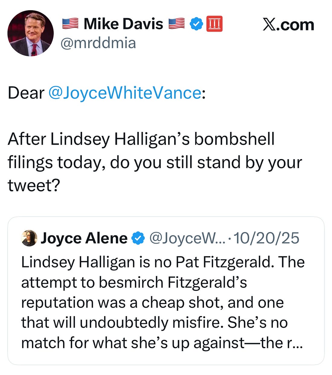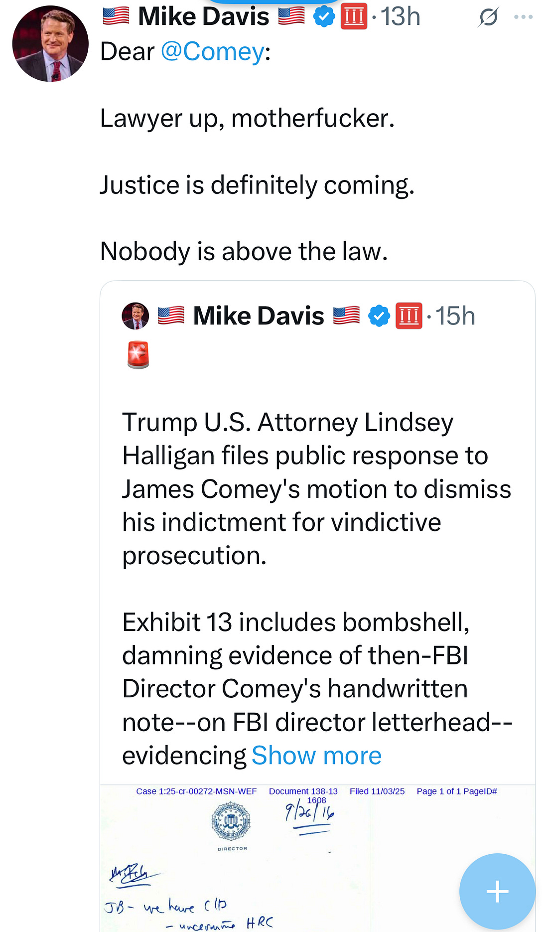 Today, in Alexandria, Virginia, a senior federal judge from South Carolina, Cameron Currie, heard oral argument on consolidated motions filed by former FBI Director Jim Comey and New York Attorney General Letitia James in their separate criminal prosecutions. Both of them filed motions challenging the legitimacy of Trump’s insurance-lawyer-turned-U.S. Attorney Lindsey Halligan’s role in their prosecution. Here’s what you need to know ahead of what Judge Currie said would be a pre-Thanksgiving decision: The motions are being heard by Judge Currie, who was appointed by the chief judge of the Fourth Circuit (where Virginia and South Carolina are both located), since it would be problematic to have a judge from the same district where a U.S. attorney has been putatively installed consider whether the appointment was proper. It’s reassuring to know that some people still care about ethics and conflicts of interest. Appearing for the Justice Department, attorney Henry Whitaker told the court that any questions about the appointment of Halligan involved, at worst, mere paperwork errors. Whitaker was the Florida Solicitor General until earlier this year. He clerked for Justice Clarence Thomas after law school and worked in the Office of Legal Counsel during the first Trump administration. Perhaps anticipating problems with the validity of Halligan’s appointment, Attorney General Pam Bondi tried to back-bless the indictments, filing that she had reviewed the grand jury proceedings. But the Judge pointed out this morning that wasn’t possible because they hadn’t been fully transcribed. And, while every attorney general would likely have loved to possess a magic wand that would permit them to fix errors after the fact, that’s not how any of this works. Prosecutors must follow the rules, which are in place to ensure that defendants’ rights are protected and justice is done. Cases are dismissed when they make procedural errors, in part to protect them and in part to deter prosecutors from making future errors. If ever an attorney general needed that sort of a reminder from the courts, it’s this one. Politico characterized the hearing this way: “A federal judge expressed deep skepticism Thursday about whether a federal prosecutor handpicked by President Donald Trump to bring criminal cases against his political rivals was legally appointed to the role.” We all know the history by now. Trump’s handpicked appointee to be U.S. Attorney in the Eastern District of Virginia, longtime, highly regarded prosecutor Erik Siebert, concluded there was insufficient evidence to indict either Comey or James. His removal and replacement with Halligan followed. Along the way, Trump stumbled, publicly posting what looked like a text message meant for Attorney General Pam Bondi: “JUSTICE MUST BE SERVED, NOW” Bondi, apparently persuaded, put Halligan in place, and Halligan promptly indicted Comey, just barely ahead of the expiration of the statute of limitations, following up with the indictment of James. The allegations that her appointment is improper have to do with the technicalities of the Vacancies Reform Act, which allows a president to replace a vacant U.S. attorney with an appointee for 120 days, after which the district court appoints an acting U.S. attorney until a presidentially appointed, Senate-confirmed nominee is put in place. Halligan’s predecessor had already been in place for 120 days when he was removed to make way for Halligan. But the government seems to be suggesting that it can swap out different people for sequential 120-day terms under the law. The defendants’ lawyers argued that if the government can continue making these interim appointments, it could perpetually avoid the constitutional requirement that the Senate confirm U.S. attorney nominees. That would give a president an open invitation to install unqualified loyalists instead of professional prosecutors for these important positions. Under the extreme facts of this case, the defendants have asked the Judge to dismiss the prosecutions with prejudice to deter future maneuvering like this. One particularly interesting exchange in court this morning occurred when Currie pointed out that the grand jury transcripts the government turned over to her in advance of the hearing for her review were missing parts of Halligan’s interactions with the grand jurors. Why excise those sensitive portions of the proceedings? We don’t know, so we’ll stick a pin in it for now. But there are strict rules governing prosecutors’ interactions with grand jurors and it’s not beyond the realm of possibility that someone with no prosecutorial experience could have transgressed them. This hearing came on the heels of a hearing before the magistrate judge who is handling preliminary motions in the Comey case. The government has asked for a filter team to evaluate evidence obtained in an unrelated investigation, filtering out any material that may be subject to the attorney client privilege so prosecutors can use the rest of it. That hearing didn’t go well for the government, with the judge ordering grand jury “minutes,” a confidential transcript, turned over to the defense. He scolded the government attorneys for the rushed prosecution, characterizing the behavior as “indict first, investigate second.” And a Trump-loyalist amen choir on Twitter has been trying to reinforce the case against allegations that it is a selective and vindictive prosecution brought against one of the key people Trump includes among his enemies. Like this tweet from MAGA operative, lawyer Mike Davis. It’s a cheap effort to tarnish Comey in the public eye. The claim Davis is making, even if it were true, is not what Comey is charged with. But Davis seems to specialize in attempted intimidations. For the record, I responded with one word, “yes.” Back to the courts—they don’t seem to be on Halligan’s side, so far, in any of these pr