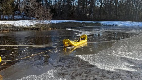 A dog was rescued Friday morning after falling through the ice in Andover, Massachusetts, fire officials said. Andover Fire Rescue said firefighters responded to Holt Road, finding the dog in the cold water of a pond. Crews in water rescue suits went into the water and used a rapid deployment craft to get the animal back to shore. |