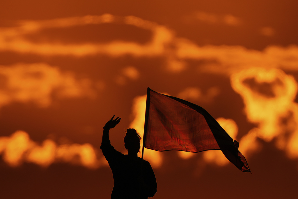 Stella Kitt holds a flag and waves to passing motorists to commemorate the anniversary of the Sept. 11 attacks from a highway overpass as the sun sets Thursday, Sept. 11, 2025, near Melvern, Kan. (AP Photo/Charlie Riedel)