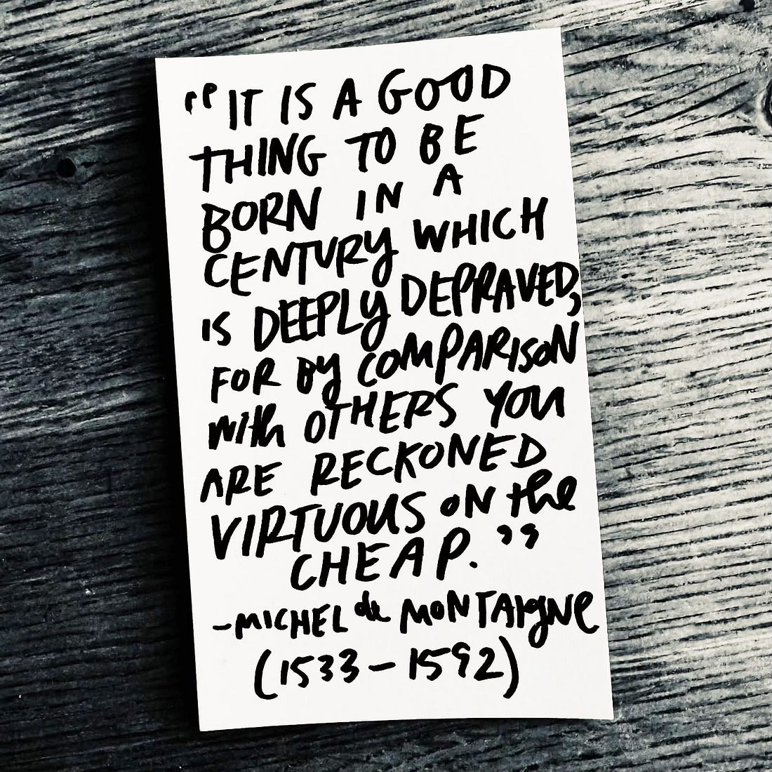 “Evil fortune does have some use: it is a good thing to be born in a century which is deeply depraved, for by comparison with others you are reckoned virtuous on the cheap.” That’s our old friend Michel de Montaigne. I’ve read a few pages of his Essays every morning of 2026, and every morning I find some wonderful 400-year-old line that speaks directly to my present moment. (Old books are time machines.) If you don’t know Montaigne’s work, check out Stefan Zweig’s short biography, written in exile during World War II. My friend Ryan Holiday loves the book so much he bought a thousand copies to stock at The Painted Porch before it went out of print. (Montaigne was an influence on my book Keep Going, and I wrote more about his famous tower in my letter, “Room To Think.”)