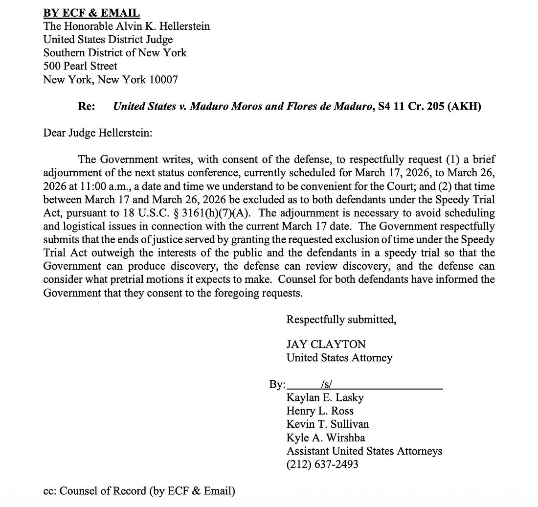 It’s another week full of legal proceedings. And a little politics, too. Tuesday: Maduro and Flores hearing The U.S.-ousted Venezuelan leader Nicolás Maduro and his wife, Cilia Flores, were captured by U.S. forces on January 3 at their Caracas home. They were arrested pursuant to an indictment federal prosecutors had obtained and taken to the U.S. to face those charges. Both pled guilty and are currently detained pending trial. The superseding indictment can be found here. We discussed it at length here. There was supposed to be a status conference on the case this Tuesday. But the government wrote the Judge, Alvin Hellerstein in the Southern District of New York, requesting a “brief continuance.” The stated reason was to permit discovery to proceed before the parties returned to court, a reasonable request given the likely amount of evidence the government will be turning over to the defense and the time it takes to review it with defendants who remain in custody. But the government has been busy on the case already, opposing the defendants’ efforts to use Venezuelan government monies to fund their defense. Prosecutors say Maduro is not the legitimate leader of Venezuela and hasn’t been considered by the U.S. to be so for several years. Madura and Flores’ lawyers argue the laws and traditions of the country permit it to fund their defense. A Venezuelan official has said they are prepared to do so. The defendants argue that their inability to access certain third-party funds to pay for their legal fees violates their Fifth and Sixth Amendment rights to due process and effective assistance of counsel. The parties have filed their briefs, and Judge Hellerstein is expected to consider the legal fees dispute during the March 26 hearing. Tuesday: Illinois Primary Illinois voters head to the polls Tuesday to choose their Democratic and Republican nominees for the open Senate seat being vacated by Dick Durbin, who is retiring after almost three decades. Two members of the House, Raja Krishnamoorthi and Robin Kelly, have thrown their hats into the ring, leaving their seats up for grabs. Three additional Illinois representatives are retiring: Danny Davis, Jan Schakowsky, and Jesus “Chuy” Garcia. That means the Illinois delegation will look different, possibly younger, heading into 2027, and we will have new names to learn. Kamala Harris won the state with 54.8% of the vote in 2024, and it’s unlikely Democrats will lose any seats. In Kelly’s district, former representative Jesse Jackson Jr, who pled guilty to misusing campaign funds in 2013 and was sentenced to 30 months in prison (he served a little under two years), is trying to make a comeback, but he is one of 10 Democrats running for the seat. Jackson, who represented the district for over 20 years before going to prison, is up by double digits in two polls. Everyone expects Governor JB Pritzker to handily win reelection. But as a potential 2028 presidential contender, there will be heavy scrutiny of how he handles himself during the campaign and how well he performs and leads the Democratic ticket. So there’s a lot to see here. Under Illinois law, only poll workers and poll watchers can be at the polls on election day, and other people may not mill around outside as voters go about their business. Nonetheless, there have been concerns that ICE might show up to intimidate people. But DHS’s Assistant Secretary for Election Integrity, Heather Honey, issued a statement in late February, saying “Any suggestion that ICE is going to be present at polling places is simply disinformation.” She committed that there would "be no ICE presence at polling locations” during a call with voting officials from across the country. That makes sense and I’m inclined to believe it. But only because doing it now would trigger legal challenges that would likely be decided against the administration. If they’re going to do this, we’ll likely see it for the first time when voters go to the polls in November. Wednesday: Fulton County. As you may recall from our earlier discussion, Judge J.P. Boulee sent the Justice Department and Fulton County to mediation in the case filed by the latter over the government’s seizure of voting records. Wednesday is the date by which the parties must let the Judge know whether they’ve been able to resolve the matter voluntarily. If mediation failed, it will be up to the Judge to decide whether the records are due to be returned, which they almost certainly are (the government gets to keep copies), but the administration could face some messy, revelatory testimony in court if the County goes into the unusual decision to have a U.S. Attorney from Missouri take over the matter, rather than the local U.S. Attorney. The Rest of the Mess Pam Bondi wants to deprive state bar associations of their ability to consider ethics challenges to federal prosecutors’ behavior. DOJ has posted a proposed new regulation in the Federal Register that would prohibit state bars from proceeding while DOJ is conducting an internal review. Nothing in the rule would preclude DOJ from engaging in endless delay and short-circuiting state investigations. In practice, state bar associations have routinely deferred to DOJ to conduct internal ethics proceedings before they act against a Justice Department lawyer. But that was under the old rules, where DOJ took ethics seriously. And as a practical matter, state bars, not Pam Bondi or Donald Trump, decide whether to give a specific lawyer a license to practice law in their state, so it’s difficult to see how the government has a legal leg to stand on here. It would be like Donald Trump deciding who can be a barber in Oklahoma or a cosmetologist in Arizona. There is a 30-day comment period for the proposed regulations that will close on April 6. Comments will be public. Expect a wide variety of members of the legal profession to weigh in against the administration’s transpar