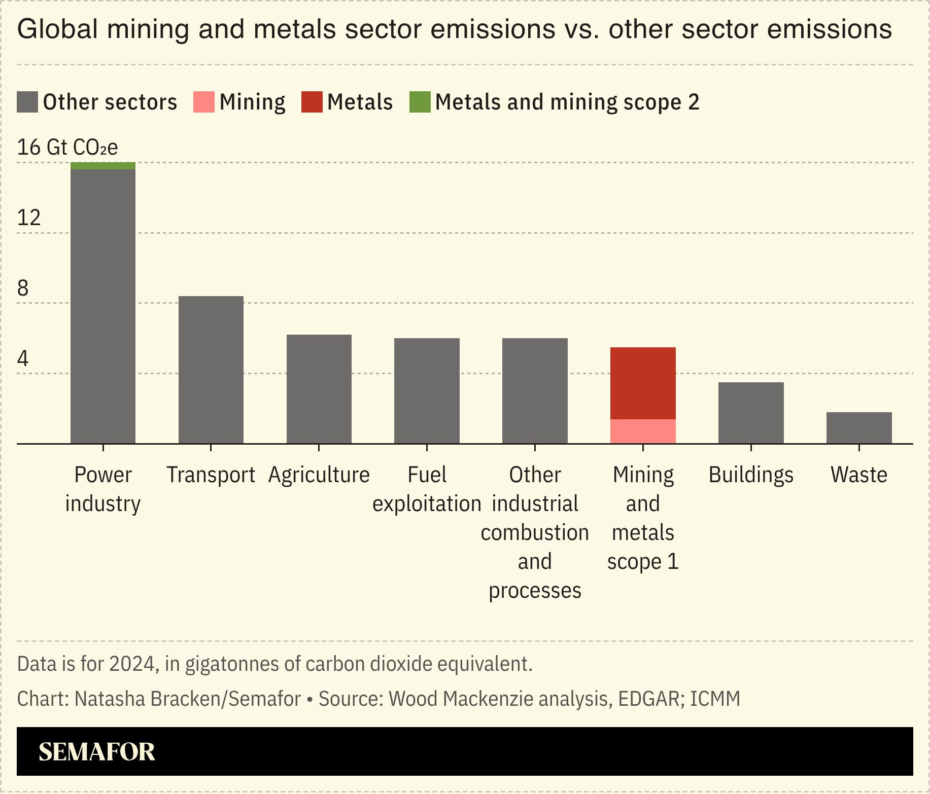 Mining and metals accounted for roughly 11% of global scope 1 and 2 greenhouse gas emissions in 2024, with a large majority originating from Asia, highlighting the sector’s role as both a major emitter and a linchpin of the clean energy transition. Within the sector, metal production accounts for 8% of total emissions, while mining, driven largely by fugitive emissions from coal, makes up the remaining 3%. Steel and aluminum production, alongside coal mining, are responsible for 93% of the sector’s emissions, according to the International Council on Mining and Metals. Yet the sector and its largest emitters are also among the most important to achieving a net-zero future. More steel will be needed for wind turbines, more aluminium for lightweight EVs, and thermal coal consumption is expected to rise in the short term as electricity demand surges. The main challenge, then, is producing more while emitting less, through emerging solutions including shifting from coal-fired blast furnaces to electric furnaces in steelmaking; and, in aluminium production, powering smelters with clean electricity and developing new processes that eliminate carbon from the smelting stage, the report’s lead researcher said. —Natasha Bracken |
