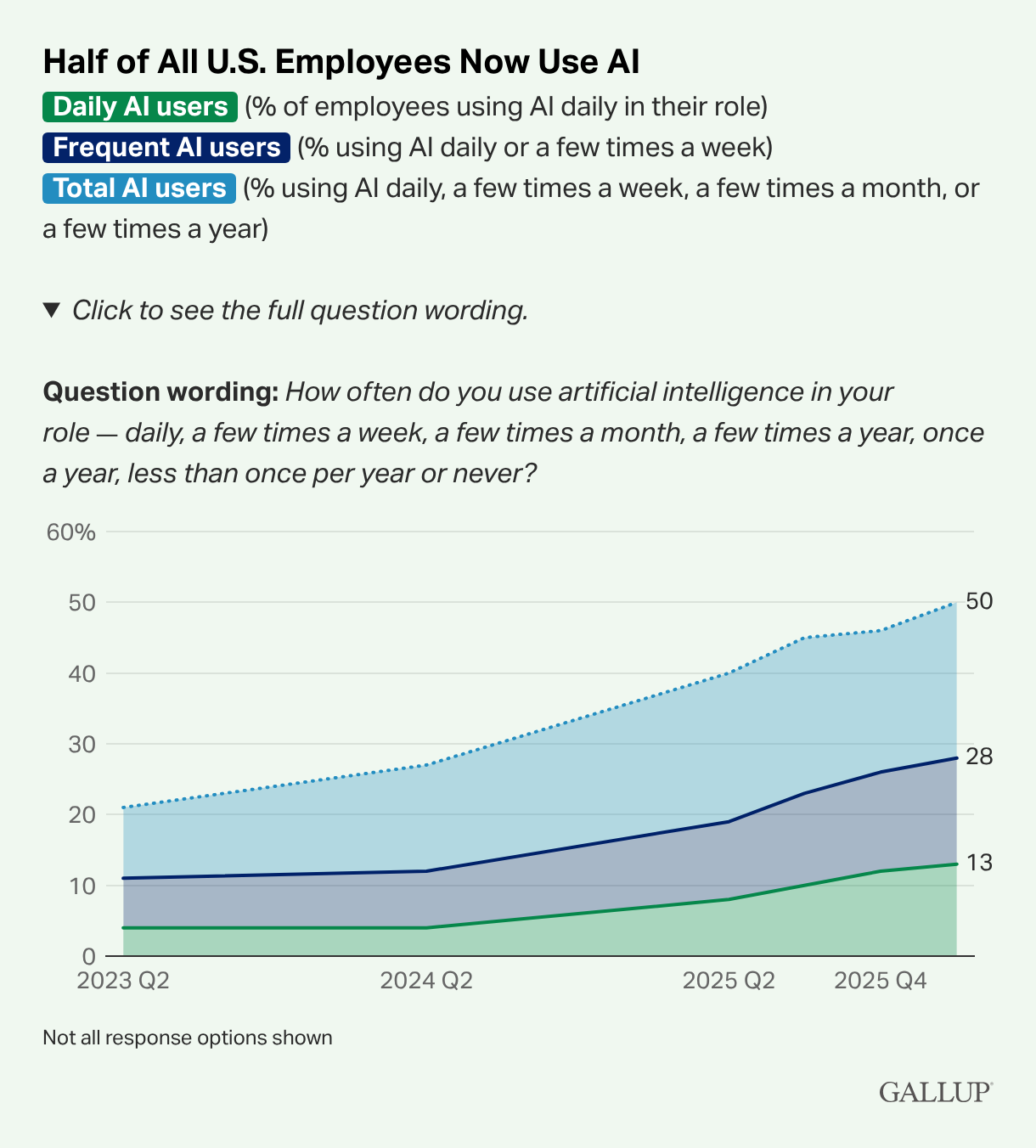 "Rising AI Adoption Spurs Workforce Changes" is a report by Gallup that finds half of employed American adults say they use AI in their role at least a few times a year, up from 46% last quarter. In addition, 13% of employees now say they use AI daily and 28% report they use it a few times a week or more.