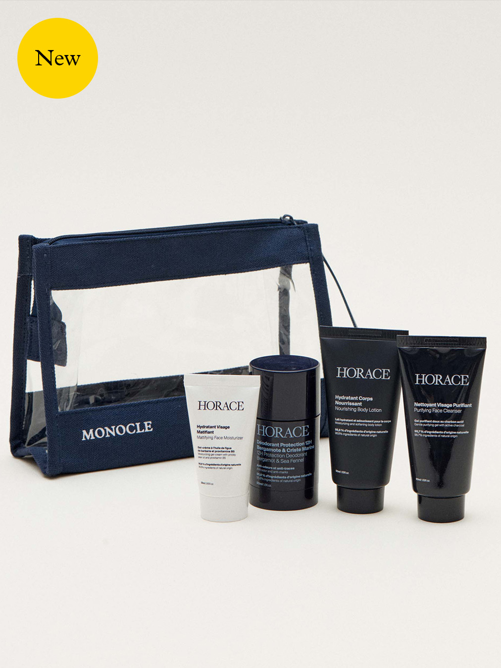 Stay fresh on the road with this travel set from French-founded men’s skincare brand Horace. Each product was hand-picked by Monocle and repackaged as a mini version. The set includes: fragrance-free face wash and moisturiser; eucalyptus & sage body lotion; and bergamot & sea fennel deodorant. Complete with a Monocle Horace co-branded travel pouch.