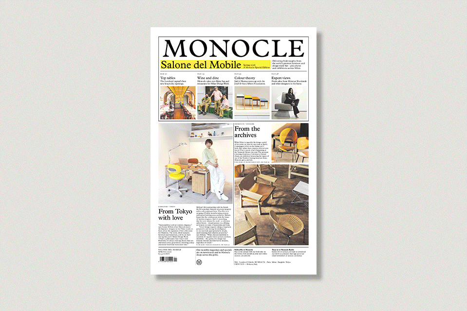 A must-read for design lovers, Monocle’s annual Salone del Mobile Special provides news, insight and analysis ahead of the industry’s biggest event in Milan. The Berliner-size newspaper covers stories from across the globe – from a partnership between Italian tile-makers and a US art foundation to the Spanish brand reviving the Eames’ modular architecture and the Japanese designer breathing new life into a Lombard icon. Plus, for those attending the fair and Milan Design Week, there’s a host of recommendations for the best spots to eat and drink, as well as tips for roadtrips beyond the city.